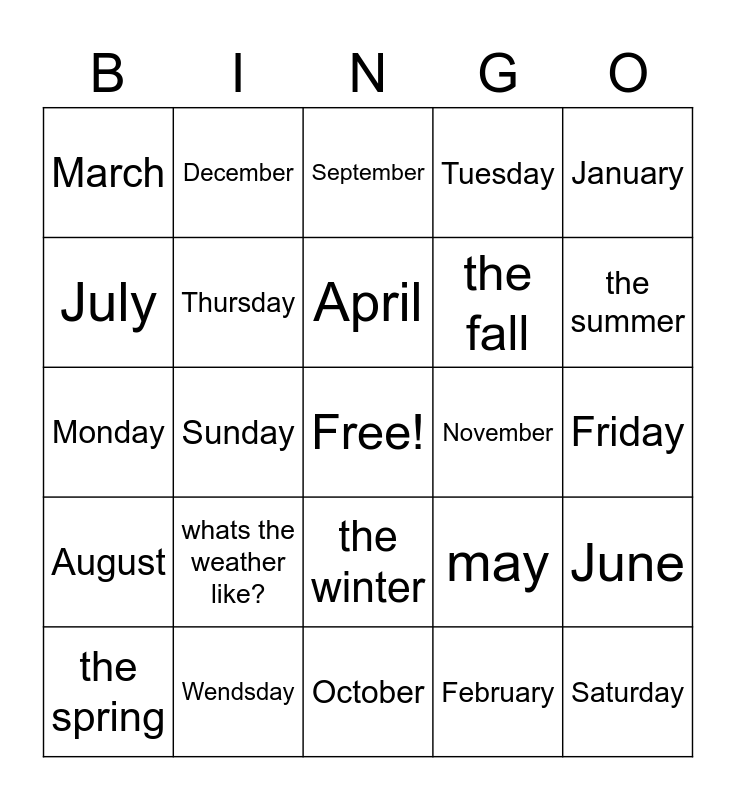This bingo card has a free space and 24 words: whats the weather like?, Wendsday, April, the spring, January, March, July, December, November, the winter, the fall, Monday, may, June, Thursday, February, Friday, September, the summer, Sunday, Saturday, August, Tuesday and October.