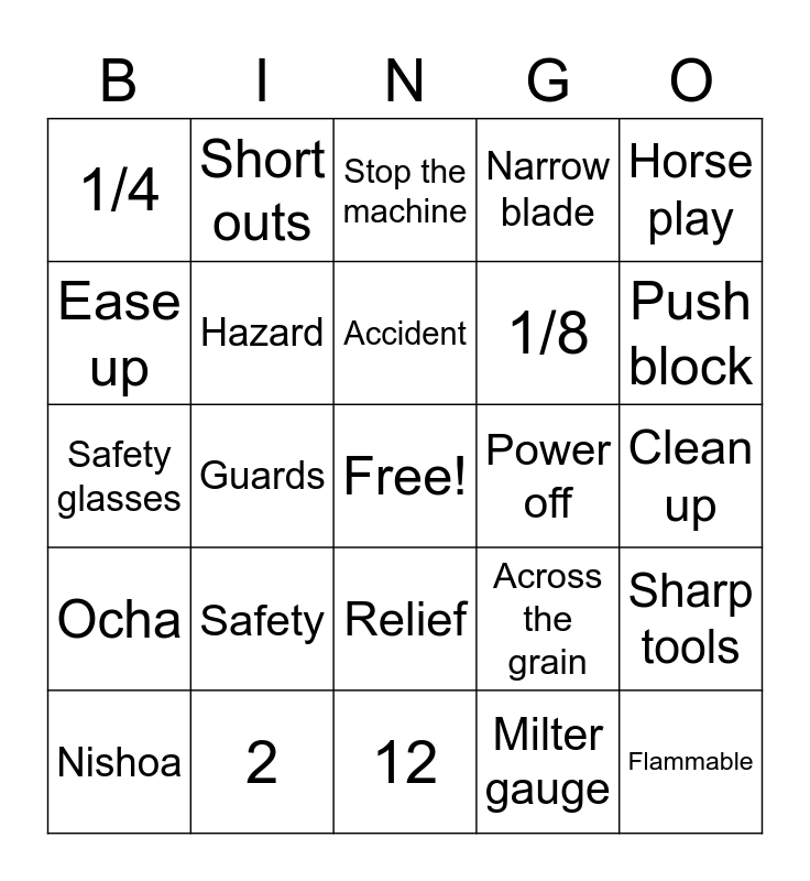 This bingo card has a free space and 24 words: Safety, 2, Accident, Nishoa, Horse play, 1/4, Ease up, Short outs, Power off, Relief, 1/8, Safety glasses, Across the grain, Sharp tools, Hazard, Milter gauge, Clean up, Stop the machine, Push block, Guards, Flammable, Ocha, Narrow blade and 12.