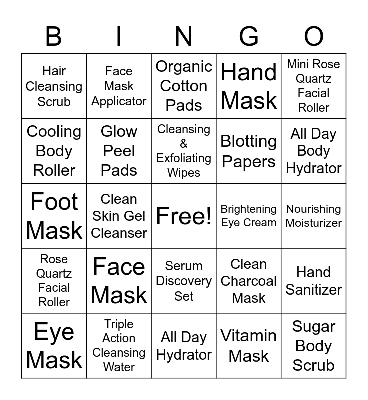 This bingo card has a free space and 30 words: Triple Action Cleansing Water, Clarifying Peel Pads, Clean Skin Gel Cleanser, Melting Cleansing Balm, Hair Cleansing Scrub, Organic Cotton Pads, Glow Peel Pads, Serum Discovery Set, Brightening Eye Cream, All Day Hydrator, Nourishing Moisturizer, Sugar Body Scrub, Vitamin Mask, Targeted Dark Spot Serum, All Day Body Hydrator, Clean Lip Balm & Scrub, Clean Charcoal Mask, Rose Quartz Facial Roller, Face Mask, Mini Rose Quartz Facial Roller, Foot Mask, Skin Perfecting Brush Set, Face Mask Applicator, Blotting Papers, Cooling Body Roller, Hand Mask, Hand Sanitizer, Eye Mask, Cleansing & Exfoliating Wipes and Nose Strips.