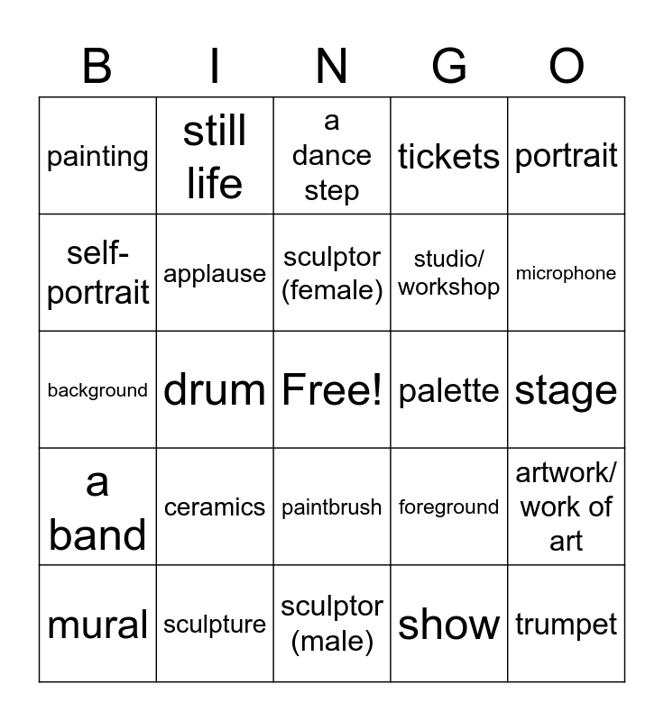 This bingo card has a free space and 24 words: ceramics, sculpture, sculptor (female), mural, portrait, painting, self-portrait, still life, palette, paintbrush, studio/ workshop, background, foreground, artwork/ work of art, applause, show, stage, a dance step, microphone, drum, trumpet, a band, tickets and sculptor (male).