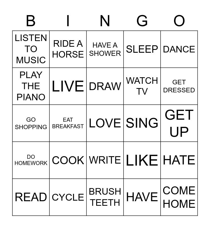 This bingo card has a free space and 24 words: COOK, CYCLE, DRAW, READ, DANCE, LISTEN TO MUSIC, PLAY THE PIANO, RIDE A HORSE, SING, WRITE, WATCH TV, GO SHOPPING, LIKE, HATE, LIVE, HAVE, GET UP, HAVE A SHOWER, GET DRESSED, EAT BREAKFAST, COME HOME, DO HOMEWORK, SLEEP and BRUSH TEETH.