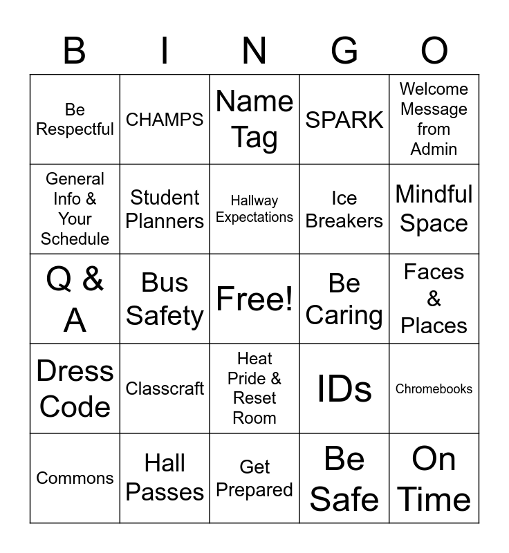 This bingo card has a free space and 31 words: Get Prepared, Classroom Expectations, Bus Safety, Before & After School, Be Respectful, Name Tag, Student Planners, IDs, Be Caring, Be Safe, Faces & Places, On Time, Acknowledgements, Be Responsible, Mindful Space, Code Switching & Appropriate Language, Chromebooks, Classcraft, Dress Code, Heat Pride & Reset Room, Welcome Message from Admin, Bathroom, Commons, CHAMPS, Ice Breakers, General Info & Your Schedule, SPARK, Q & A, Hall Passes, Hallway Expectations and Electronics.