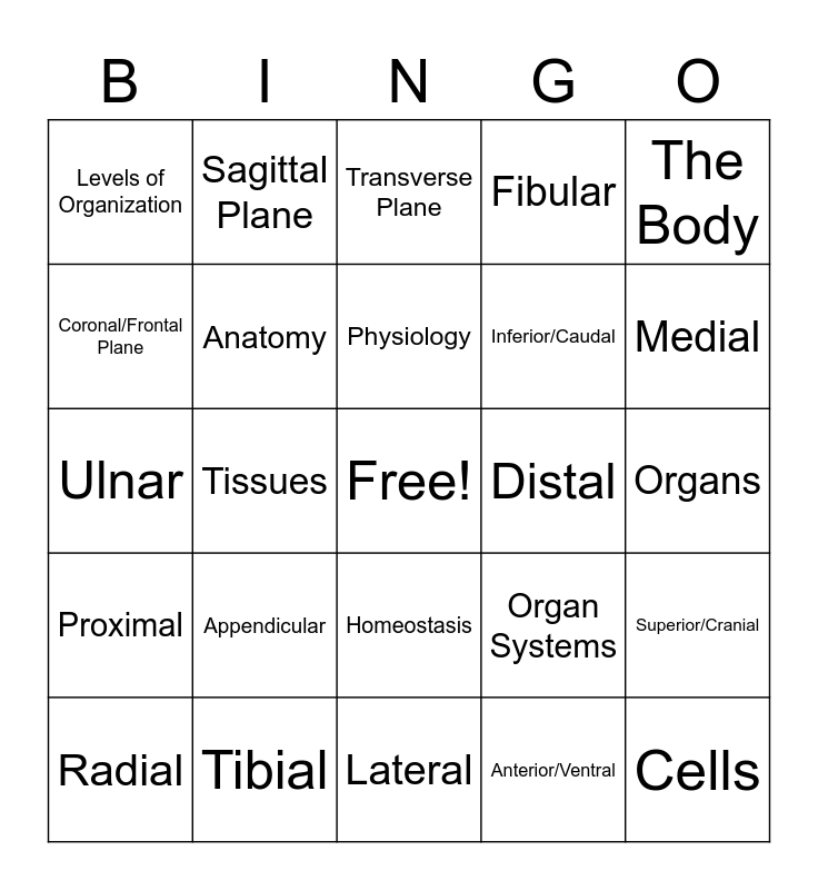 This bingo card has a free space and 28 words: Superior/Cranial, Posterior/Dorsal, Inferior/Caudal, Anterior/Ventral, Coronal/Frontal Plane, Transverse Plane, Sagittal Plane, Proximal, Distal, Radial, Ulnar, Fibular, Tibial, Lateral, Medial, Axial, Appendicular, Anatomy, Physiology, Homeostasis, Levels of Organization, Form Follows Function, Cells, Tissues, Organs, Organ Systems, The Body and Death.