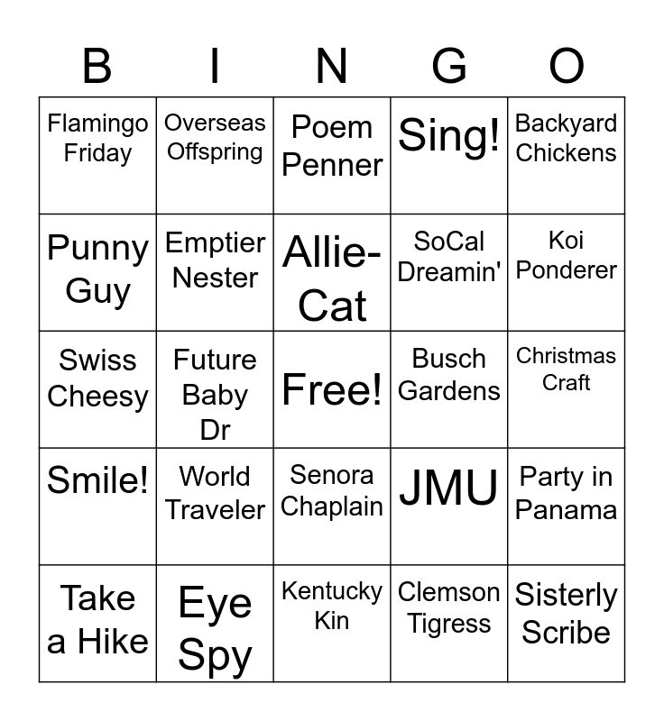 This bingo card has a free space and 27 words: JMU, Chinchilla Mama, SoCal Dreamin', Kentucky Kin, Punny Guy, Poem Penner, Overseas Offspring, Smile!, Busch Gardens, Party in Panama, Swiss Cheesy, Sing!, Take a Hike, Eye Spy, Koi Ponderer, Golden Doodle, Emptier Nester, Allie-Cat, World Traveler, Flamingo Friday, Christmas Craft, Clemson Tigress, Future Baby Dr, Sisterly Scribe, Senora Chaplain, Backyard Chickens and LaSalsa Queen.