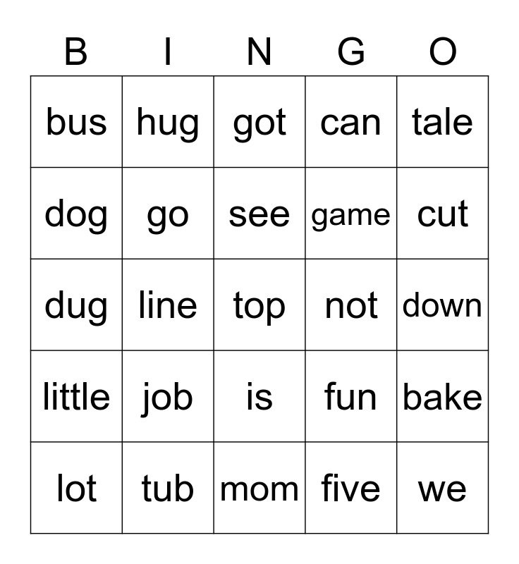 This bingo card has a free space and 24 words: job, tub, see, lot, tale, bus, dog, hug, not, is, game, dug, fun, bake, go, five, down, got, cut, line, we, little, can and mom.