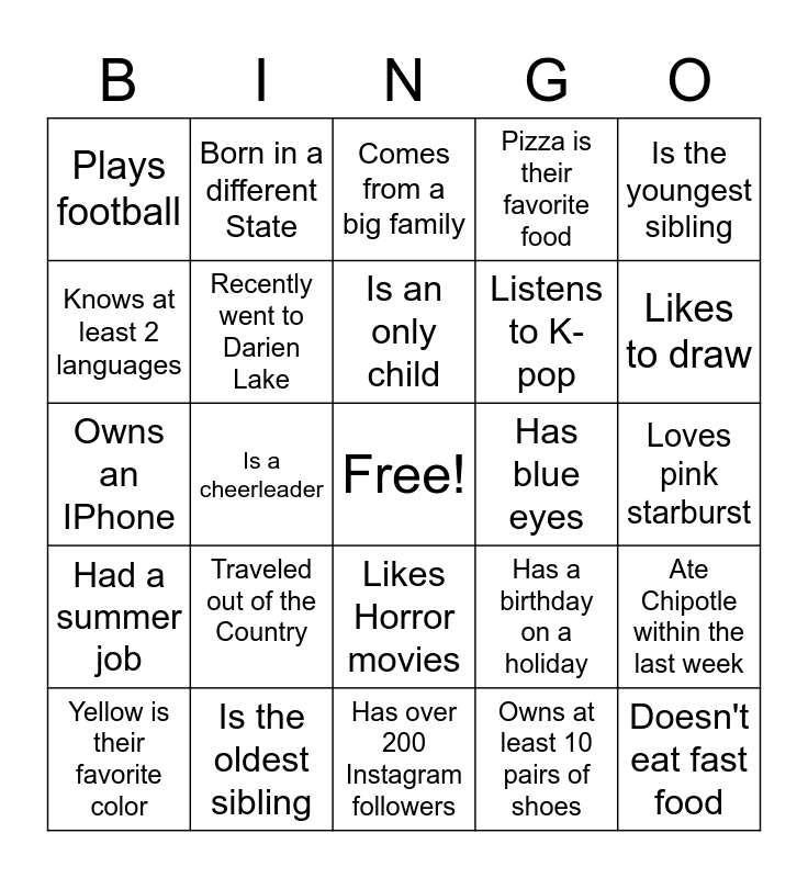 This bingo card has a free space and 24 words: Traveled out of the Country, Is the oldest sibling, Is an only child, Yellow is their favorite color, Is the youngest sibling, Plays football, Knows at least 2 languages, Born in a different State, Has blue eyes, Likes Horror movies, Listens to K-pop, Owns an IPhone, Has a birthday on a holiday, Ate Chipotle within the last week, Recently went to Darien Lake, Owns at least 10 pairs of shoes, Loves pink starburst, Comes from a big family, Likes to draw, Is a cheerleader, Doesn't eat fast food, Had a summer job, Pizza is their favorite food and Has over 200 Instagram followers.