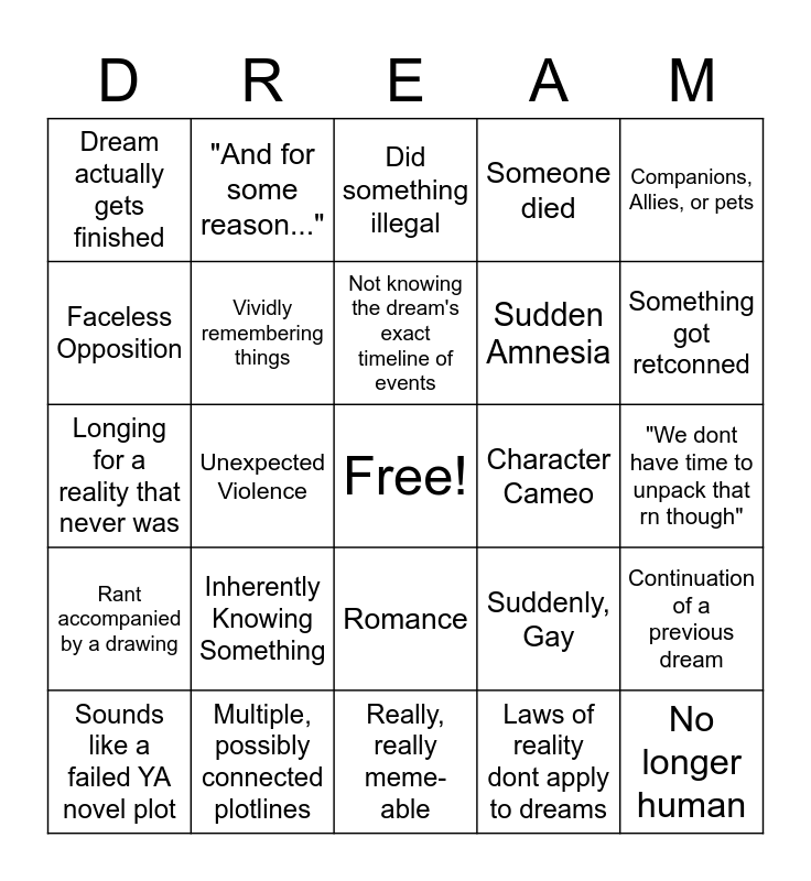 This bingo card has a free space and 24 words: Inherently Knowing Something, Multiple, possibly connected plotlines, Not knowing the dream's exact timeline of events, Sounds like a failed YA novel plot, Companions, Allies, or pets, Dream actually gets finished, Faceless Opposition, "And for some reason...", Character Cameo, Romance, Sudden Amnesia, Longing for a reality that never was, Suddenly, Gay, Continuation of a previous dream, Vividly remembering things, Laws of reality dont apply to dreams, "We dont have time to unpack that rn though", Did something illegal, Something got retconned, Unexpected Violence, No longer human, Rant accompanied by a drawing, Someone died and Really, really meme-able.
