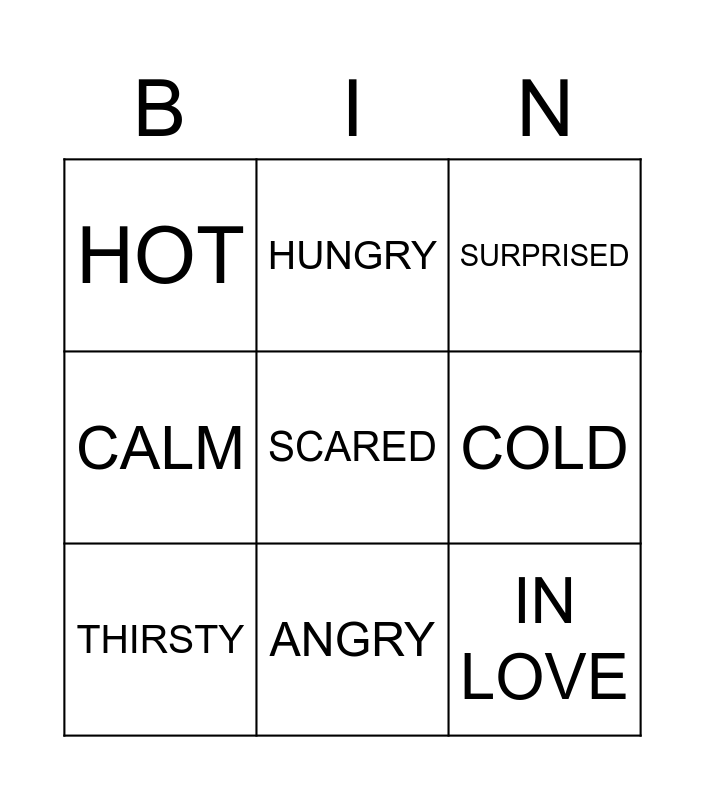 This bingo card has 13 words: HAPPY, SAD, THIRSTY, HUNGRY, CALM, SCARED, IN LOVE, TIRED, ANGRY, HOT, COLD, SURPRISED and BORED.