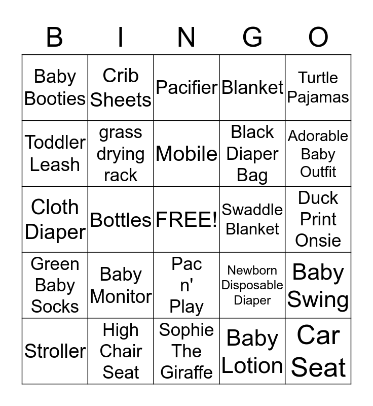 This bingo card has a free space and 24 words: Baby Monitor, High Chair Seat, Mobile, Stroller, Turtle Pajamas, Baby Booties, Toddler Leash, Crib Sheets, Swaddle Blanket, Pac n' Play, Black Diaper Bag, Cloth Diaper, Newborn Disposable Diaper, Baby Swing, grass drying rack, Baby Lotion, Duck Print Onsie, Pacifier, Adorable Baby Outfit, Bottles, Car Seat, Green Baby Socks, Blanket and Sophie The Giraffe.