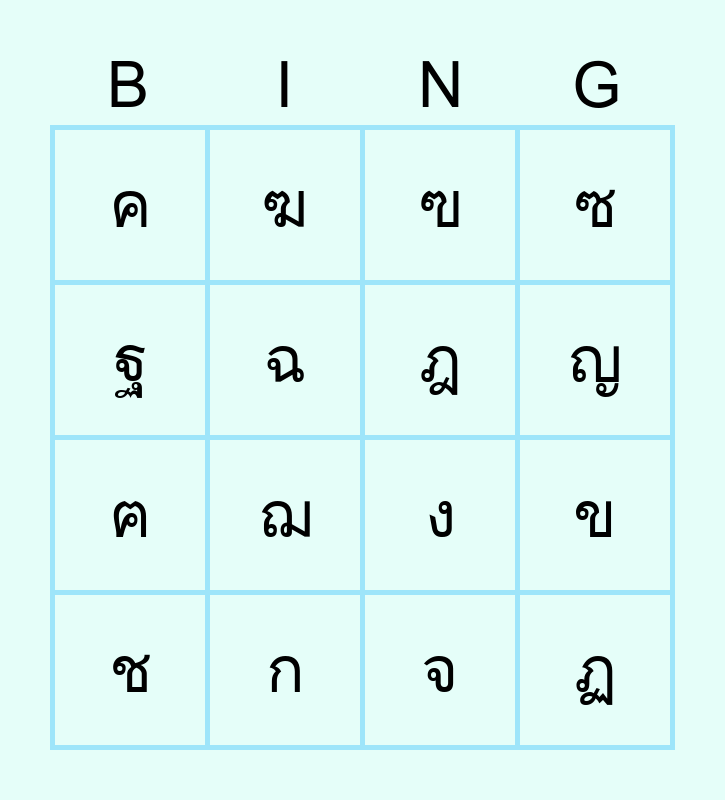 This bingo card has 16 words: ก, ข, ฃ, ค, ฅ, ฆ, ง, จ, ฐ, ฉ, ช, ซ, ฌ, ญ, ฎ and ฏ.