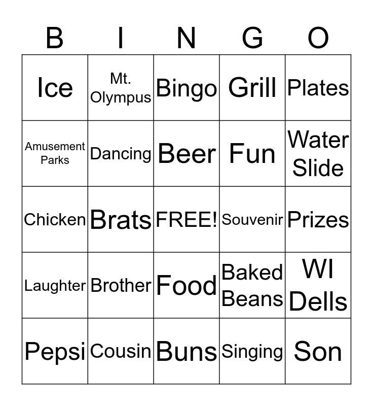 This bingo card has a free space and 24 words: Brother, Cousin, Beer, Pepsi, Plates, Ice, Amusement Parks, Mt. Olympus, Souvenir, Food, Fun, Chicken, Baked Beans, WI Dells, Dancing, Singing, Prizes, Bingo, Water Slide, Brats, Son, Laughter, Grill and Buns.