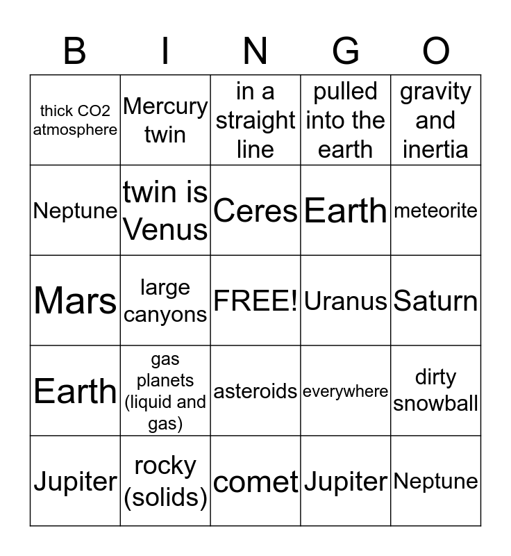 This bingo card has a free space and 24 words: gas planets (liquid and gas), rocky (solids), Ceres, Jupiter, gravity and inertia, thick CO2 atmosphere, Neptune, Mercury twin, Uranus, asteroids, Earth, Mars, everywhere, dirty snowball, twin is Venus, Jupiter, Saturn, in a straight line, meteorite, large canyons, Neptune, Earth, pulled into the earth and comet.