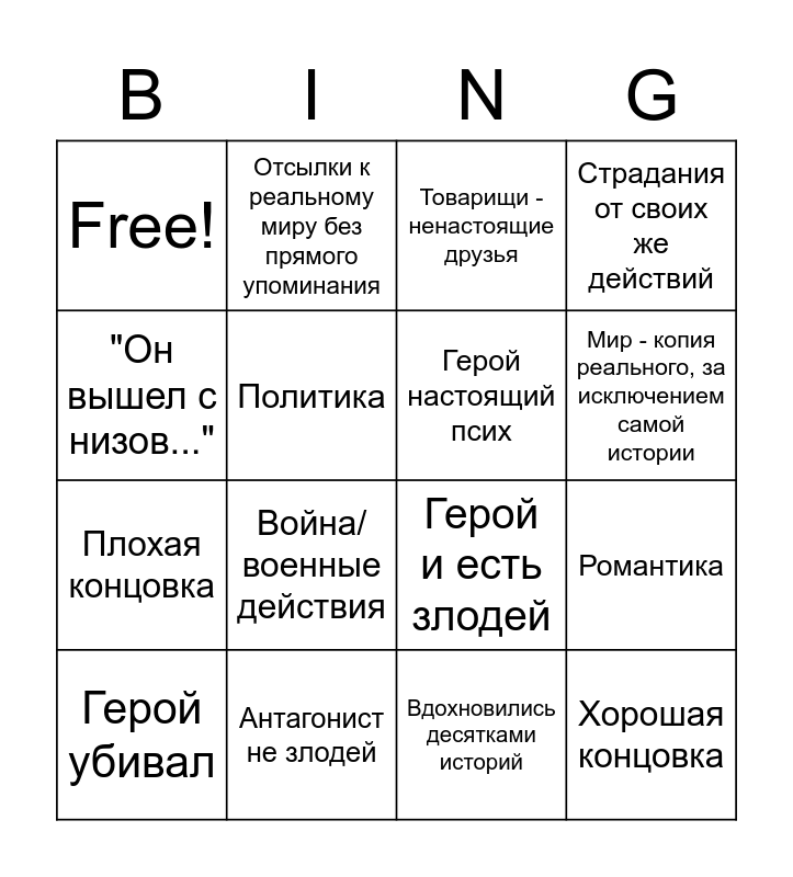 This bingo card has 16 words: Герой убивал, Антагонист не злодей, Товарищи - ненастоящие друзья, Страдания от своих же действий, "Он вышел с низов...", Отсылки к реальному миру без прямого упоминания, Герой и есть злодей, Романтика, Free!, Политика, Вдохновились десятками историй, Мир - копия реального, за исключением самой истории, Плохая концовка, Война/военные действия, Герой настоящий псих and Хорошая концовка.