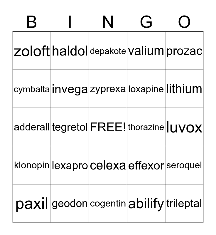 This bingo card has a free space and 24 words: lexapro, geodon, zyprexa, paxil, prozac, zoloft, cymbalta, haldol, thorazine, celexa, loxapine, adderall, effexor, seroquel, invega, abilify, luvox, depakote, lithium, tegretol, trileptal, klonopin, valium and cogentin.
