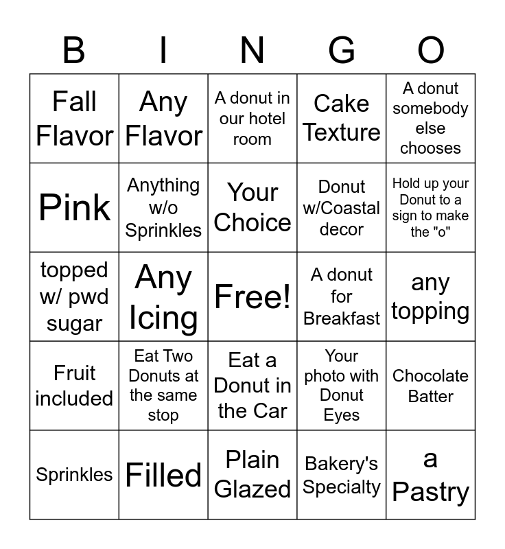 This bingo card has a free space and 30 words: Chocolate Icing, Filled, A donut in our hotel room, The clerk's choice, A donut somebody else chooses, Fall Flavor, Anything w/o Sprinkles, Your Choice, Donut w/Coastal decor, a Pastry, Sprinkles, Eat Two Donuts at the same stop, Bakery's Specialty, Donut w/a Lobster on it, Fruit included, Hot Now, Plain Glazed, A donut for Breakfast, Chocolate Batter, Pink, Any Icing, Cranberry, Cake Texture, any topping, topped w/ pwd sugar, Any Flavor, Eat a Donut in the Car, Your photo with Donut Eyes, Hold up your Donut to a sign to make the "o" and Photo w/ a donut sign.