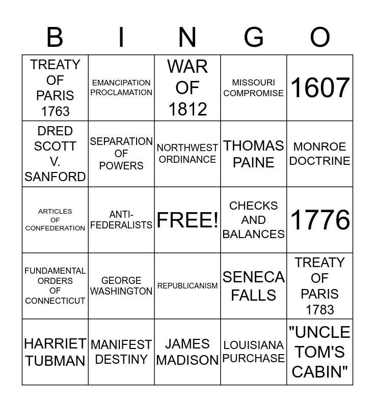 This bingo card has a free space and 24 words: GEORGE WASHINGTON, MANIFEST DESTINY, NORTHWEST ORDINANCE, HARRIET TUBMAN, 1607, TREATY OF PARIS 1763, DRED SCOTT V. SANFORD, EMANCIPATION PROCLAMATION, CHECKS AND BALANCES, REPUBLICANISM, THOMAS PAINE, ARTICLES OF CONFEDERATION, SENECA FALLS, TREATY OF PARIS 1783, SEPARATION OF POWERS, LOUISIANA PURCHASE, 1776, WAR OF 1812, MONROE DOCTRINE, ANTI- FEDERALISTS, "UNCLE TOM'S CABIN", FUNDAMENTAL ORDERS OF CONNECTICUT, MISSOURI COMPROMISE and JAMES MADISON.