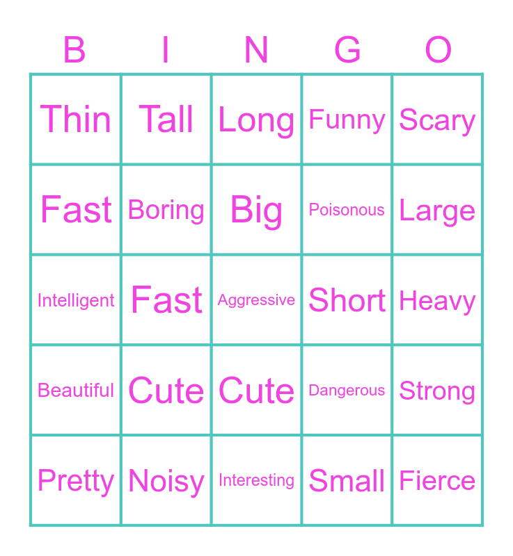 This bingo card has a free space and 24 words: Pretty, Cute, Big, Small, Scary, Thin, Tall, Long, Short, Heavy, Intelligent, Boring, Dangerous, Strong, Fast, Noisy, Interesting, Funny, Large, Beautiful, Fast, Cute, Poisonous and Fierce.
