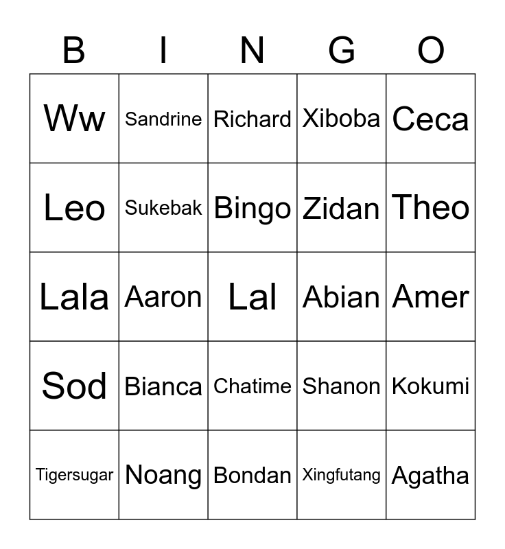 This bingo card has a free space and 24 words: Bianca, Noang, Bingo, Tigersugar, Ceca, Ww, Leo, Sandrine, Abian, Chatime, Zidan, Lala, Shanon, Kokumi, Sukebak, Xingfutang, Amer, Richard, Theo, Aaron, Agatha, Sod, Xiboba and Bondan.