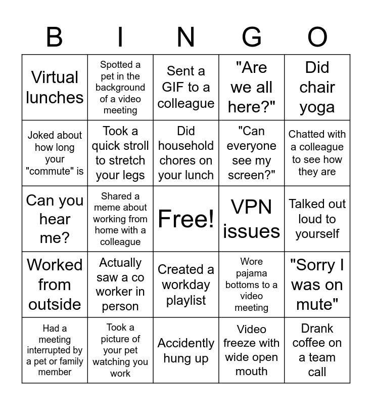 This bingo card has a free space and 24 words: Actually saw a co worker in person, Took a picture of your pet watching you work, Did household chores on your lunch, Had a meeting interrupted by a pet or family member, Did chair yoga, Virtual lunches, Joked about how long your "commute" is, Spotted a pet in the background of a video meeting, VPN issues, Created a workday playlist, "Can everyone see my screen?", Can you hear me?, Wore pajama bottoms to a video meeting, "Sorry I was on mute", Took a quick stroll to stretch your legs, Video freeze with wide open mouth, Talked out loud to yourself, Sent a GIF to a colleague, Chatted with a colleague to see how they are, Shared a meme about working from home with a colleague, Drank coffee on a team call, Worked from outside, "Are we all here?" and Accidently hung up.