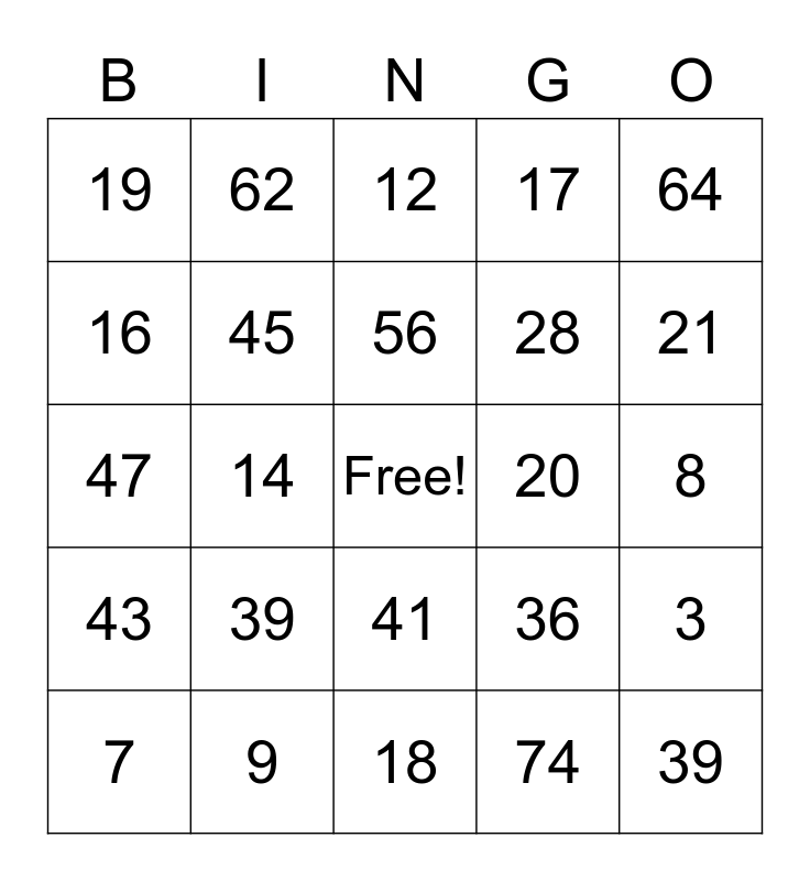 This bingo card has a free space and 24 words: 39, 9, 56, 7, 64, 19, 16, 62, 20, 41, 28, 47, 36, 3, 45, 74, 8, 12, 21, 14, 39, 43, 17 and 18.