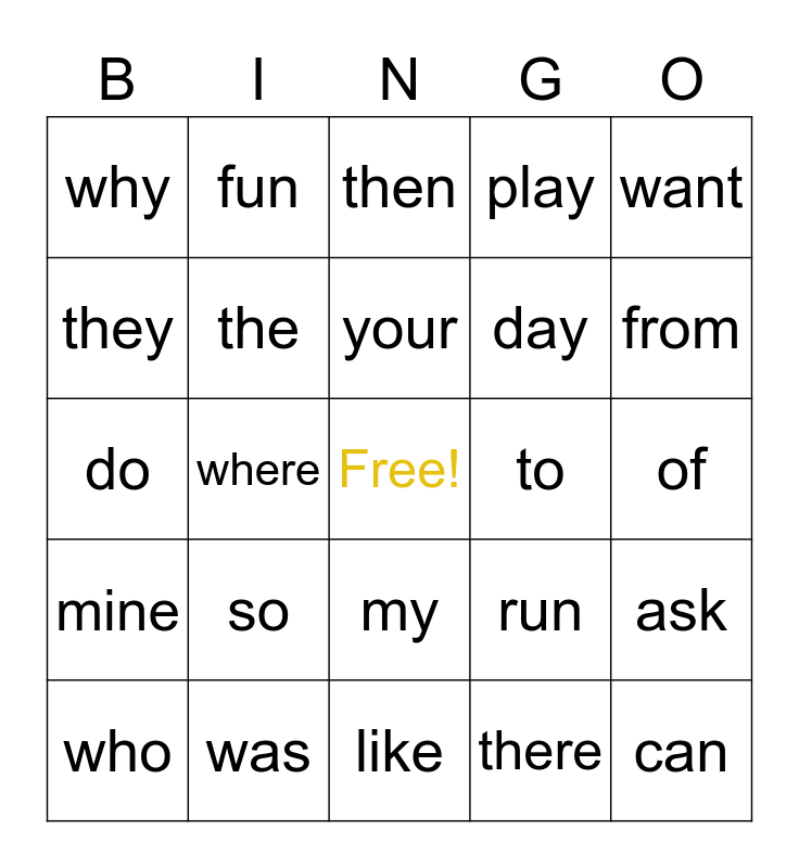 This bingo card has a free space and 29 words: who, what, where, when, why, then, the, so, to, was, of, can, like, there, from, by, my, mine, want, do, run, read, day, they, play, fun, ask, your and in.