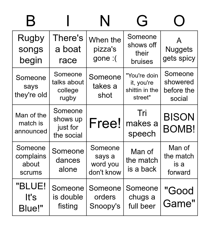 This bingo card has a free space and 24 words: Someone dances alone, Someone is double fisting, Someone takes a shot, "BLUE! It's Blue!", A Nuggets gets spicy, Rugby songs begin, Someone says they're old, There's a boat race, Tri makes a speech, Someone says a word you don't know, "You're doin it, you're shittin in the street", Man of the match is announced, Man of the match is a back, Man of the match is a forward, Someone talks about college rugby, Someone chugs a full beer, BISON BOMB!, When the pizza's gone :(, Someone showered before the social, Someone shows up just for the social, "Good Game", Someone complains about scrums, Someone shows off their bruises and Someone orders Snoopy's.