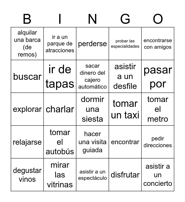 This bingo card has 41 words: Gratis, explorar, dar una vuelta, ir de tapas, mirar las vitrinas, hacer una visita guiada, sacar dinero del cajero automático, meterse en problemas, encontrarse con amigos, relajarse, charlar, probar las especialidades, dormir una siesta, tomar el metro, tomar un taxi, tomar el autobús, perder, alquilar una barca (de remos), comprar entradas, perderse, pedir direcciones, asistir a un concierto, asistir a un espectáculo, asistir a un desfile, asistir a una corrida de toros, hacer los mandados, disfrutar, pasar un buen rato, pasar por, esperar, hacer un recorrido (por), ir a un parque de atracciones, degustar vinos, comprar, encontrar, buscar, visitar, ver, volver, viajar and hacer un viaje.
