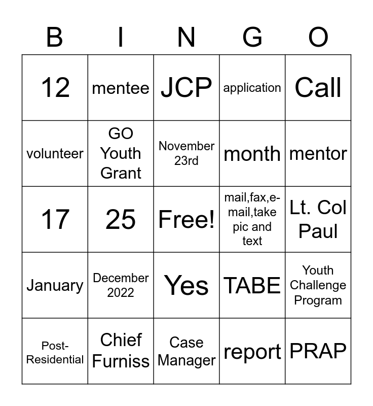 This bingo card has a free space and 29 words: Post-Residential, 4, 25, every 3 months, 12, JCP, GO Youth Grant, December 2022, mail,fax,e-mail,take pic and text, Chief Furniss, Lt. Col Paul, PRAP, Case Manager, report, mentor, 1st, Yes, January, Call, 17, TABE, ASVAB, month, volunteer, application, mentee, Youth Challenge Program, November 23rd and S.M.A.R.T.