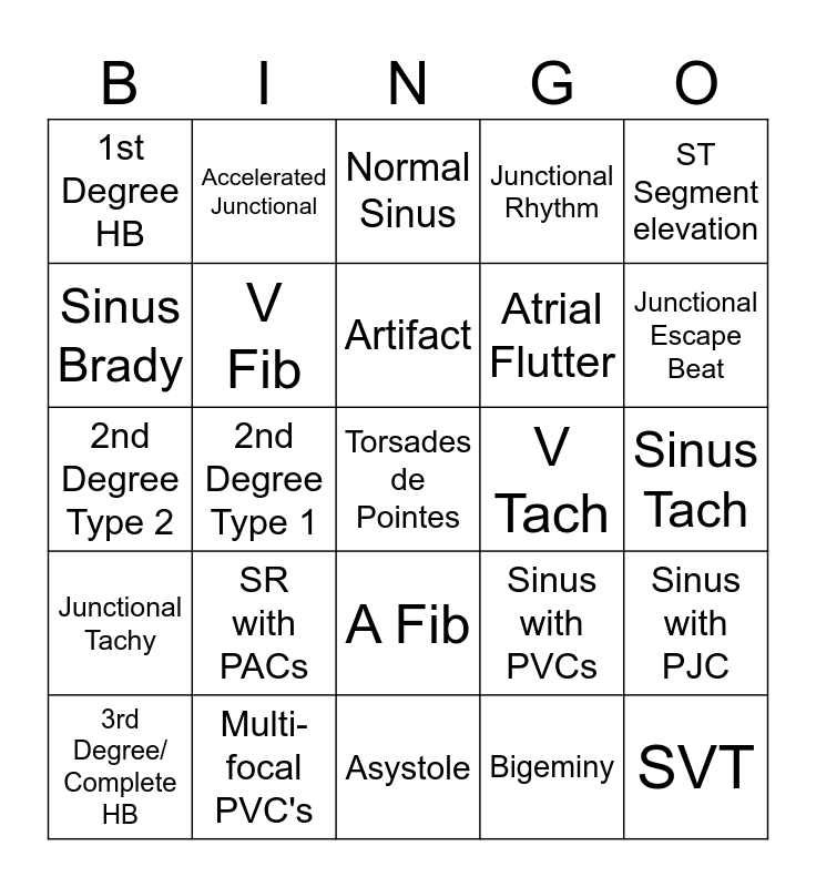 This bingo card has a free space and 24 words: SR with PACs, Multi-focal PVC's, Artifact, 3rd Degree/ Complete HB, ST Segment elevation, 1st Degree HB, Sinus Brady, Accelerated Junctional, V Tach, A Fib, Atrial Flutter, 2nd Degree Type 2, Sinus with PVCs, Sinus with PJC, V Fib, Bigeminy, Sinus Tach, Normal Sinus, Junctional Escape Beat, 2nd Degree Type 1, SVT, Junctional Tachy, Junctional Rhythm and Asystole.