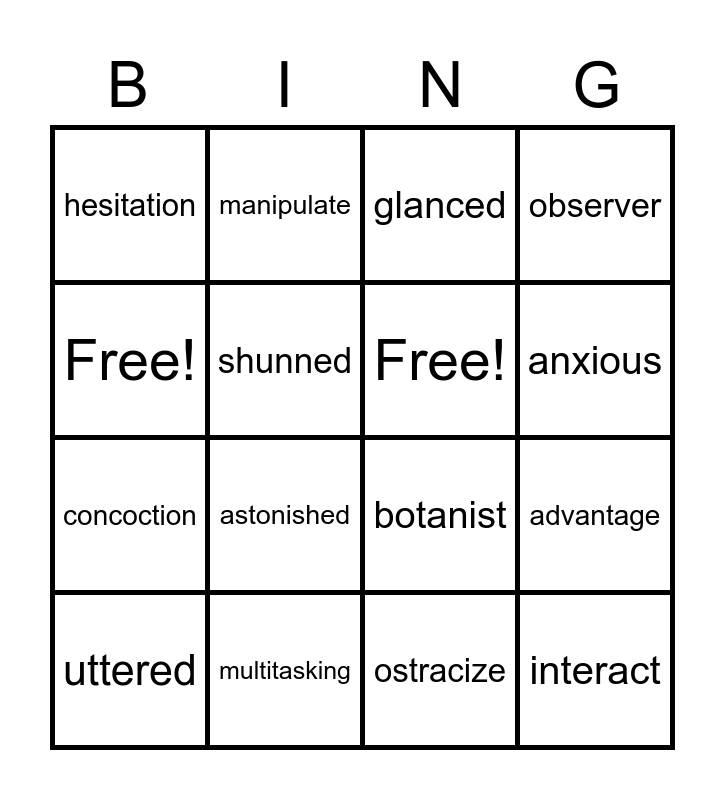 This bingo card has 16 words: multitasking, advantage, glanced, hesitation, concoction, manipulate, botanist, ostracize, Free!, shunned, uttered, observer, astonished, anxious, Free! and interact.