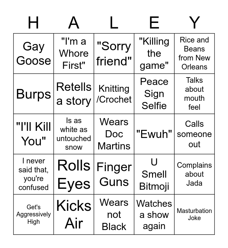 This bingo card has a free space and 24 words: Rolls Eyes, Kicks Air, Knitting /Crochet, Get's Aggressively High, Rice and Beans from New Orleans, Gay Goose, Burps, "I'm a Whore First", "Ewuh", Finger Guns, Peace Sign Selfie, "I'll Kill You", U Smell Bitmoji, Complains about Jada, Retells a story, Watches a show again, Calls someone out, "Sorry friend", Talks about mouth feel, Is as white as untouched snow, Masturbation Joke, I never said that, you're confused, "Killing the game" and Wears not Black.