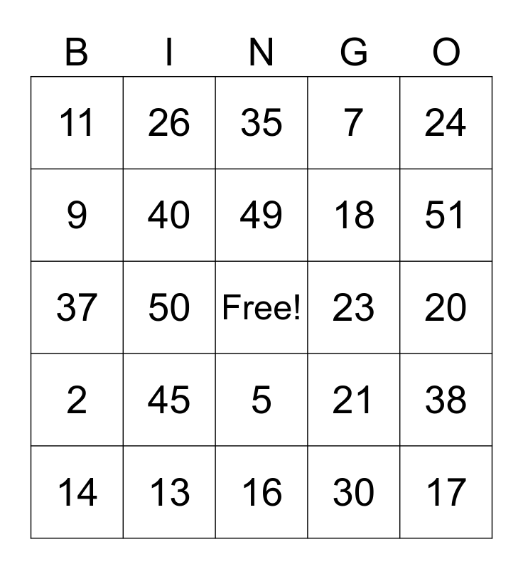 This bingo card has a free space and 54 words: 1, 2, 3, 4, 5, 6, 7, 8, 9, 10, 11, 12, 13, 14, 15, 16, 17, 18, 19, 20, 21, 22, 23, 24, 25, 26, 27, 28, 29, 30, 31, 32, 33, 34, 35, 36, 37, 38, 39, 40, 41, 42, 43, 44, 45, 46, 47, 48, 49, 50, 51, 52, 53 and 54.