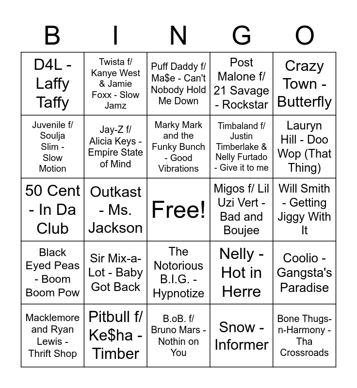 This bingo card has a free space and 42 words: Vanilla Ice - Ice Ice Baby, Marky Mark and the Funky Bunch - Good Vibrations, Kriss Kross - Jump, Sir Mix-a-Lot - Baby Got Back, Snow - Informer, Coolio - Gangsta's Paradise, Bone Thugs-n-Harmony - Tha Crossroads, 2Pac - California Love, Puff Daddy f/ Ma$e - Can't Nobody Hold Me Down, The Notorious B.I.G. - Hypnotize, Will Smith - Getting Jiggy With It, Lauryn Hill - Doo Wop (That Thing), Outkast - Ms. Jackson, Crazy Town - Butterfly, Ja Rule f/ Ashanti - Always on Time, Nelly - Hot in Herre, Eminem - Lose Yourself, 50 Cent - In Da Club, Ludacris f/ Shawnna - Stand Up, Twista f/ Kanye West & Jamie Foxx - Slow Jamz, Juvenile f/ Soulja Slim - Slow Motion, Terror Squad - Lean Back, Snoop Dogg f/ Pharrell - Drop it Like it's Hot, D4L - Laffy Taffy, Chamillionaire f/ Krazie Bone - Ridin, Mims - This is Why I'm Hot, Timbaland f/ Justin Timberlake & Nelly Furtado - Give it to me, Soulja Boy - Crank That, Flo Rida - Low, Lil Wayne f/ Static Major - Lollipop, T.I. - Whatever you Like, Black Eyed Peas - Boom Boom Pow, Jay-Z f/ Alicia Keys - Empire State of Mind, B.oB. f/ Bruno Mars - Nothin on You, Wiz Khalifia - Black and Yellow, Macklemore and Ryan Lewis - Thrift Shop, Pitbull f/ Ke$ha - Timber, Migos f/ Lil Uzi Vert -Bad and Boujee, Kendrick Lamar - Humble, Cardi B - Bodak Yellow, Post Malone f/ 21 Savage - Rockstar and Childish Gambino - This is America.