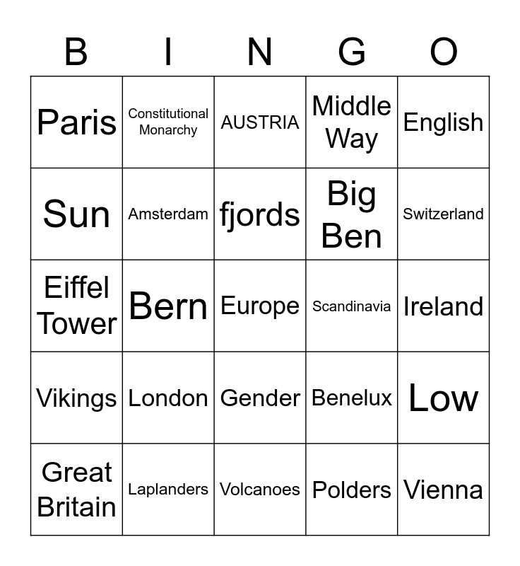 This bingo card has a free space and 24 words: London, Laplanders, fjords, Great Britain, English, Paris, Sun, Constitutional Monarchy, Scandinavia, Gender, Big Ben, Eiffel Tower, Benelux, Low, Amsterdam, Polders, Ireland, AUSTRIA, Switzerland, Bern, Vienna, Vikings, Middle Way and Volcanoes.