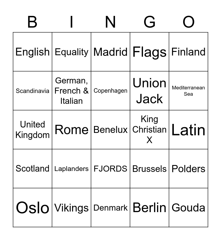 This bingo card has a free space and 24 words: Laplanders, Vikings, Copenhagen, Oslo, Finland, English, Scandinavia, Equality, King Christian X, FJORDS, Union Jack, United Kingdom, Brussels, Polders, German, French & Italian, Berlin, Latin, Madrid, Mediterranean Sea, Rome, Gouda, Scotland, Flags and Denmark.