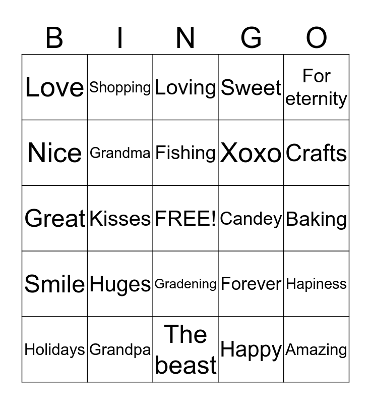 This bingo card has a free space and 24 words: Huges, Grandpa, Fishing, Holidays, For eternity, Love, Nice, Shopping, Candey, Gradening, Xoxo, Great, Forever, Hapiness, Grandma, Happy, Baking, Loving, Crafts, Kisses, Amazing, Smile, Sweet and The beast.