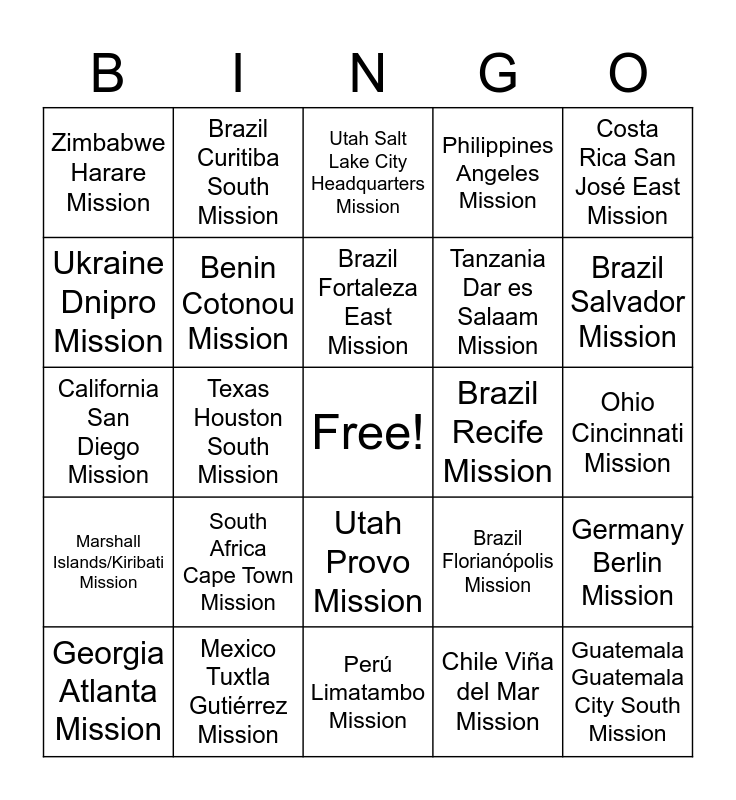 This bingo card has a free space and 407 words: Virginia Richmond Mission, Nigeria Lagos Mission, Ghana Accra West Mission, Philippines Cavite Mission, Costa Rica San José East Mission, Russia Novosibirsk Mission, Guatemala Guatemala City East Mission, Nigeria Benin City Mission, Philippines Baguio Mission, Scotland/Ireland Mission (Edinburgh), Puerto Rico San Juan Mission, Texas Austin Mission, Mexico Tijuana Mission, Ghana Kumasi Mission, El Salvador San Salvador West/Belize Mission, Massachusetts Boston Mission, Louisiana Baton Rouge Mission, Zambia Lusaka Mission, Sierra Leone Freetown Mission, Canada Calgary Mission, Italy Milan Mission, India New Delhi Mission, Brazil Salvador South Mission, Venezuela Valencia Mission, Arizona Phoenix Mission, Mexico Puebla North Mission, California San Bernardino Mission, Mexico Mexico City South Mission, Nigeria Ibadan Mission, Utah Salt Lake City Headquarters Mission, Guatemala Retalhuleu Mission, Papua New Guinea Lae Mission, Mexico Mérida Mission, Canada Winnipeg Mission, Chile Santiago West Mission, Oregon Portland Mission, Denmark Copenhagen Mission, Utah Salt Lake City Mission, Japan Kobe Mission, Utah Provo Mission, Papua New Guinea Port Moresby Mission, Mexico Tuxtla Gutiérrez Mission, Philippines Davao Mission, Mexico Veracruz Mission, Honduras Comayaguela Mission, Mexico Pachuca Mission, South Carolina Columbia Mission, Mexico Monterrey East Mission, Mexico Cancún Mission, Minnesota Minneapolis Mission, Brazil São Paulo East Mission, Texas San Antonio Mission, Honduras Tegucigalpa Mission, Angola Luanda Mission, Philippines San Pablo Mission, Washington Spokane Mission, Washington Everett Mission, Brazil Fortaleza Mission, Australia Perth Mission, Côte d'Ivoire Abidjan Mission, Pennsylvania Pittsburgh Mission, Church Service Mission, Idaho Idaho Falls Mission, Florida Jacksonville Mission, California Oakland/San Francisco Mission, Brazil Fortaleza East Mission, Brazil Recife Mission, Brazil São Paulo Interlagos Mission, Philippines Cebu East Mission, Benin Cotonou Mission, Singapore Mission, Utah St. George Mission, Bolivia La Paz Mission, Mexico Chihuahua Mission, Brazil Cuiabá Mission, Ecuador Guayaquil South Mission, Ecuador Quito North Mission, Arizona Mesa Mission, Philippines Laoag Mission, Utah Salt Lake City South Mission, Idaho Boise Mission, Georgia Atlanta North Mission, Montana Billings Mission, Zimbabwe Bulawayo Mission, Brazil Salvador Mission, Mexico Villahermosa Mission, Perú Trujillo South Mission, Idaho Pocatello Mission, Philippines Tacloban Mission, Marshall Islands/Kiribati Mission, Brazil Goiânia Mission, Mexico Guadalajara East Mission, New Zealand Wellington Mission, Argentina Buenos Aires South Mission, Paraguay Asunción Mission, Russia Rostov-na-Donu Mission, New Zealand Hamilton Mission, England London Mission, Bolivia Santa Cruz North Mission, Nicaragua Managua South Mission, Kansas Wichita Mission, Adriatic North Mission (Zagreb), Ohio Cincinnati Mission, Mozambique Beira Mission, Missouri Independence Mission, Spain Barcelona Mission, Thailand Bangkok Mission, Australia Sydney Mission, Argentina Córdoba Mission, Brazil Curitiba Mission, England Birmingham Mission, Poland Warsaw Mission, Argentina Bahía Blanca Mission, Arizona Gilbert Mission, Russia Yekaterinburg Mission, Chile Concepción South Mission, Japan Tokyo South Mission, Nigeria Port Harcourt Mission, Dominican Republic Santo Domingo East Mission, Taiwan Taichung Mission, Fiji Suva Mission, Arkansas Bentonville Mission, Philippines Cagayan De Oro Mission, Bolivia La Paz El Alto Mission, Argentina Mendoza Mission, Barbados Bridgetown Mission, Colorado Colorado Springs Mission, New Zealand Auckland Mission, Philippines Iloilo Mission, Brazil Juiz de Fora Mission, Botswana/Namibia Mission, Russia Moscow Mission, Arizona Tucson Mission, North Carolina Raleigh Mission, Pennsylvania Philadelphia Mission, Chile Osorno Mission, Ecuador Guayaquil North Mission, Côte d'Ivoire Yamoussoukro Mission, California Los Angeles Mission, Brazil Manaus Mission, Oregon Salem Mission, Chile Concepción Mission, Venezuela Barcelona Mission, Oregon Eugene Mission, Kentucky Louisville Mission, Chile Viña del Mar Mission, Uganda Kampala Mission, Côte d'Ivoire Abidjan West Mission, Texas Fort Worth Mission, Mexico Mexico City North Mission, Texas Lubbock Mission, Germany Frankfurt Mission, Perú Iquitos Mission, Canada Toronto Mission, Samoa Apia Mission, Alabama Birmingham Mission, Georgia Atlanta Mission, Nicaragua Managua North Mission, California Santa Rosa Mission, Nevada Las Vegas Mission, Philippines Manila Mission, Perú Limatambo Mission, Philippines Angeles Mission, Brazil Recife South Mission, Jamaica Kingston Mission, New York Syracuse Mission, Philippines Antipolo Mission, Washington, D.C. North Mission, Panama Panama City Mission, Adriatic South Mission (Tirana), Ghana Accra Mission, Colombia Barranquilla Mission, Brazil São Paulo North Mission, South Africa Johannesburg Mission, Perú Chiclayo Mission, Michigan Lansing Mission, Nigeria Enugu Mission, Nevada Reno Mission, Honduras San Pedro Sula East Mission, Mexico Culiacán Mission, Texas McAllen Mission, Texas Houston South Mission, Costa Rica San José West Mission, Brazil Porto Alegre South Mission, Mexico Torreón Mission, Democratic Republic of the Congo Lubumbashi Missio..., Mexico Aguascalientes Mission, California Arcadia Mission, Ohio Columbus Mission, France Lyon Mission, Colorado Denver South Mission, Ecuador Guayaquil East Mission, Japan Fukuoka Mission, Nebraska Omaha Mission, Wisconsin Milwaukee Mission, California Anaheim Mission, Brazil Santos Mission, Colorado Denver North Mission, Philippines Quezon City North Mission, Perú Lima East Mission, Chile Antofagasta Mission, Australia Melbourne Mission, Tennessee Nashville Mission, Mexico Oaxaca Mission, El Salvador Santa Ana Mission, Republic of the Congo Brazzaville Mission, Brazil Brasília Mission, Democratic Republic of the