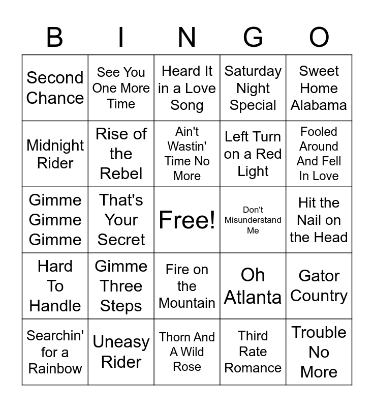 This bingo card has a free space and 106 words: Free Bird, Ramblin' Man, Sweet Home Alabama, The South's Gonna Do It Again, Can't You See, Whipping Post, There Goes Another Love Song, Dixie Chicken, Flirtin' with Disaster, Caught Up In You, Midnight Rider, Take the Highway, One Way Out, Green Grass & High Tides, The Devil Went Down to Georgia, Hold On Loosely, Heard It in a Love Song, Jim Dandy, Jessica, Train Train, Fire on the Mountain, Simple Man, Black Betty, Keep On Smilin', I'm No Angel, Gimme Three Steps, Fooled Around And Fell In Love, Saturday Night Special, Statesboro Blues, Keep Your Hands to Yourself, Oh Atlanta, Third Rate Romance, Homesick, Southbound, Highway Song, (Ghost) Riders In The Sky, Jackie Blue, Can't Keep Running, Ain't Wastin' Time No More, Georgia Rhythm, Bounty Hunter, Blue Sky, Miss Understanding, Hard To Handle, That Smell, Midnight Rider, Southern Comfort, Second Chance, Tuesday's Gone, Trouble No More, Willin', Uneasy Rider, Duane's Tune, I Know A Little, Long Haired Country Boy, Hot 'Lanta, Battleship Chains, Rockin' Into The Night, Open Road, See You One More Time, Before the Bullets Fly, Pretty Little Lie, Dreams I'll Never See, On The Hunt, Takin' Up Space, Bad Little Doggie, Party in the Parking Lot, Travelin' Shoes, Left Turn on a Red Light, Gimme Gimme Gimme, That's Your Secret, Thorn And A Wild Rose, Fire In The Kitchen, Brickyard Road - l, Ain't Life Grand, Feats Don't Fail Me Now, Island, Don't Pass Me By, Southern Hospitality, Time To Roll, Rattlesnake Rock 'N' Roller, Mind Bender, Shake 'Em On Down, Coming Home, Ain't Much Left of Me, Goddamn Lonely Love, Don't Misunderstand Me, Sweet Southern Wind, Don't Know Where I'm Bound, Country Side Of Life, Grey Ghost, Warrior, Two Wheels, Goin' Down South, Castle Rock, Gator Country, Climb to Safety, Soulshine, Rock Bottom, Hit the Nail on the Head, Rise of the Rebel, Refried Funky Chicken, Champagne Jam, It Hurts To Want It So Bad, Searchin' for a Rainbow and Come On.