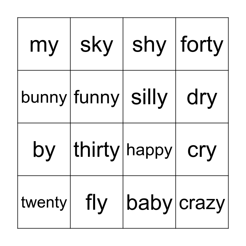 This bingo card has 16 words: fly, cry, shy, my, by, sky, happy, baby, bunny, funny, twenty, forty, thirty, dry, silly and crazy.