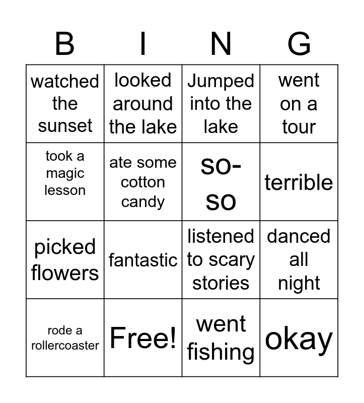 This bingo card has 16 words: Free!, danced all night, Jumped into the lake, watched the sunset, picked flowers, looked around the lake, listened to scary stories, went fishing, took a magic lesson, ate some cotton candy, rode a rollercoaster, went on a tour, fantastic, terrible, so-so and okay.