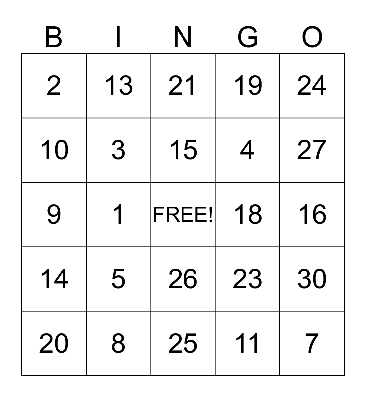 This bingo card has a free space and 24 words: 5, 8, 15, 20, 24, 2, 10, 13, 18, 26, 4, 9, 23, 30, 3, 11, 16, 21, 27, 1, 7, 14, 19 and 25.