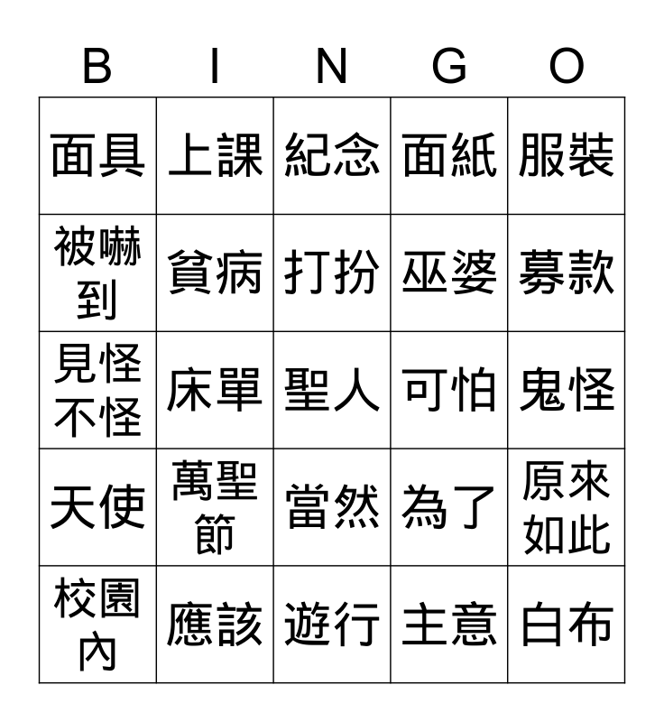 This bingo card has 25 words: 萬聖節, 遊行, 打扮, 校園內, 服裝, 面具, 被嚇到, 上課, 可怕, 當然, 巫婆, 見怪不怪, 為了, 原來如此, 貧病, 白布, 鬼怪, 紀念, 募款, 床單, 聖人, 應該, 天使, 面紙 and 主意.