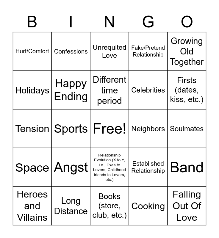 This bingo card has a free space and 24 words: Angst, Long Distance, Different time period, Heroes and Villains, Growing Old Together, Hurt/Comfort, Holidays, Confessions, Neighbors, Relationship Evolution (X to Y, i.e., Exes to Lovers, Childhood friends to Lovers, etc.), Celebrities, Tension, Established Relationship, Band, Happy Ending, Cooking, Soulmates, Unrequited Love, Firsts (dates, kiss, etc.), Sports, Falling Out Of Love, Space, Fake/Pretend Relationship and Books (store, club, etc.).