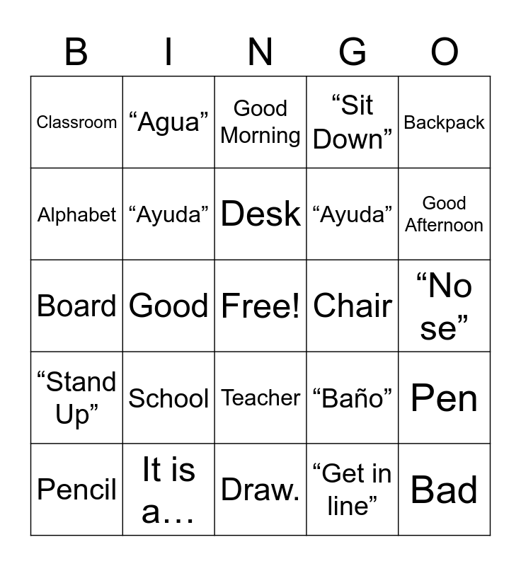 This bingo card has a free space and 24 words: School, It is a…, Desk, Pencil, Backpack, Classroom, Alphabet, “Agua”, Chair, Teacher, “Ayuda”, Board, “Baño”, Pen, “Ayuda”, “Get in line”, “No se”, Good Morning, Good Afternoon, Good, Bad, “Stand Up”, “Sit Down” and Draw..