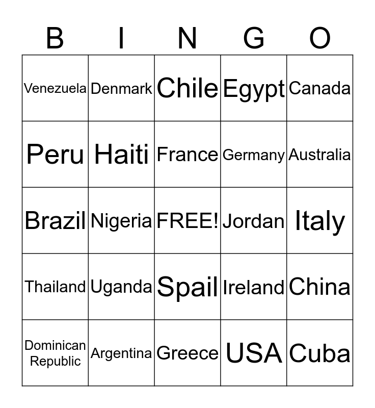 This bingo card has a free space and 32 words: USA, Russia, Nigeria, Mexico, Thailand, Haiti, Canada, China, Denmark, England, France, Chile, Japan, Turkey, Jordan, Croatia, Dominican Republic, Brazil, Spail, Uganda, Ireland, Nigeria, Italy, Argentina, Cuba, Egypt, Germany, Peru, Venezuela, Greece, Scotland and Australia.
