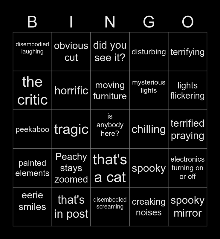 This bingo card has 57 words: surreal, eerie smiles, ghostly children, disembodied laughing, disembodied screaming, bizarre, horrific, strange, mysterious lights, shadowy figures, disturbing, horrifying, sinister, ghostly apparitions, it doesn't go well, shocking, terrifying, tragic, scary, is anybody here?, chilling, creepy, spooky, did you see it?, give us a sign, moving furniture, moving items, tech malfunctioning, lights flickering, lights failing, doors opening or closing, pareidolia, sleep paralysis, terrible speakers, terrified praying, the critic, RUN AWAY, peekaboo, blend tool, painted elements, obvious cut, that's a cat, spooky mirror, night vision, fake night vision, planted prop, Peachy stays zoomed, that's in post, atrocious camera, great acting, bad acting, creaking noises, static camera, spirit box, mysterious music, electronics turning on or off and footsteps.