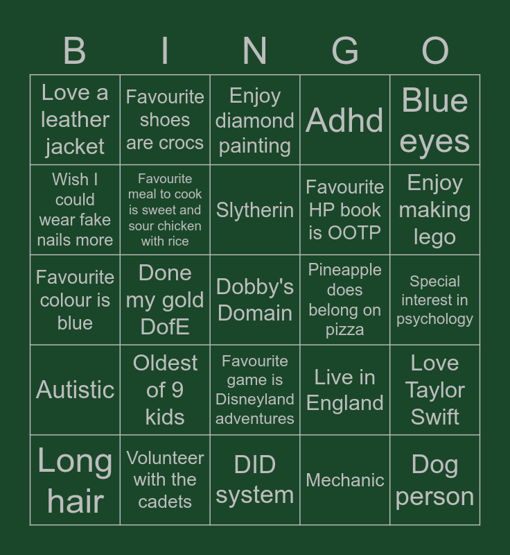 This bingo card has a free space and 24 words: Oldest of 9 kids, Volunteer with the cadets, Slytherin, Long hair, Blue eyes, Love a leather jacket, Wish I could wear fake nails more, Favourite shoes are crocs, Pineapple does belong on pizza, Favourite game is Disneyland adventures, Favourite HP book is OOTP, Favourite colour is blue, Live in England, Love Taylor Swift, Favourite meal to cook is sweet and sour chicken with rice, Mechanic, Special interest in psychology, Enjoy diamond painting, Enjoy making lego, Done my gold DofE, Dog person, Autistic, Adhd and DID system.