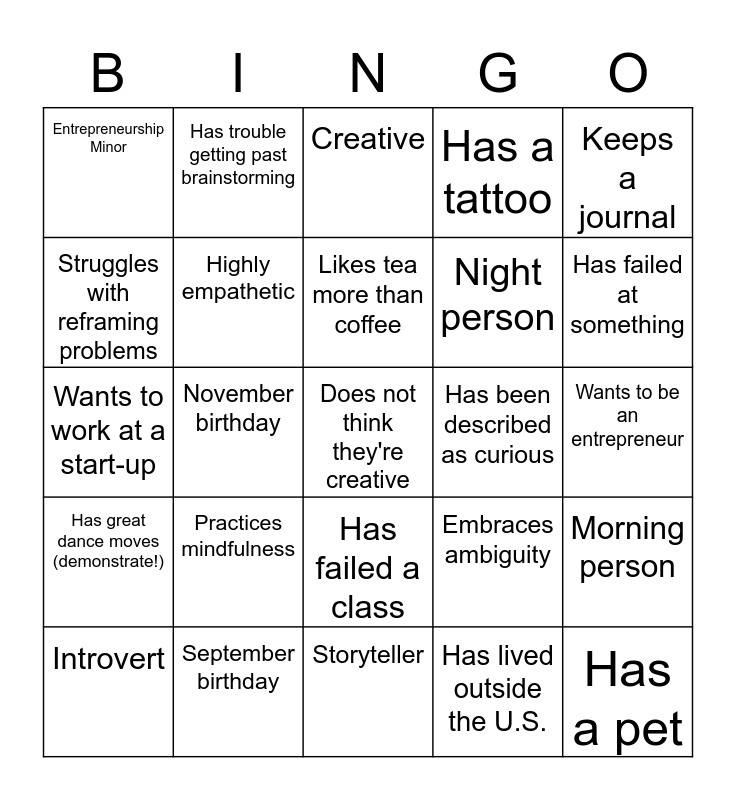 This bingo card has 30 words: September birthday, Free!, November birthday, Values process over outcome, Entrepreneurship Minor, Creative, Highly empathetic, Has failed a class, Has been described as curious, Storyteller, Wants to be an entrepreneur, Does not think they're creative, Has lived outside the U.S., Has a pet, Has failed at something, Optimistic, Embraces ambiguity, Has great dance moves (demonstrate!), Practices mindfulness, Keeps a journal, Wants to work at a start-up, Dislikes chocolate, Has trouble getting past brainstorming, Night person, Struggles with reframing problems, Has a tattoo, Morning person, Introvert, Likes tea more than coffee and Does not think they're creative.