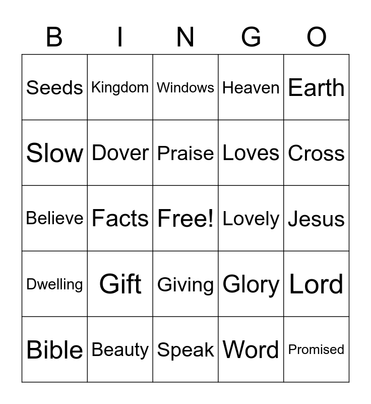 This bingo card has a free space and 29 words: Bible, Third, Facts, Francis, Seeds, Windows, Dover, Gift, Lovely, Beauty, Jesus, Promised, Speak, Word, Cross, Father, Giving, Dwelling, Earth, Believe, Glory, Son, Loves, Slow, Heaven, Kingdom, Lord, Praise and God.