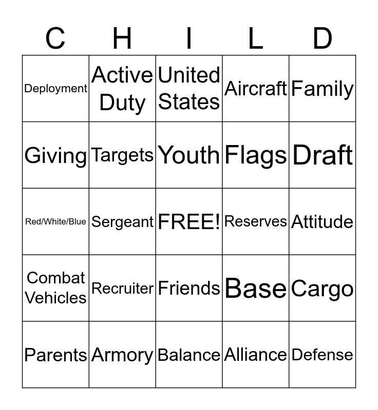 This bingo card has a free space and 24 words: Recruiter, Armory, Youth, Parents, Family, Deployment, Giving, Active Duty, Reserves, Friends, Flags, Red/White/Blue, Base, Cargo, Targets, Alliance, Attitude, United States, Draft, Sergeant, Defense, Combat Vehicles, Aircraft and Balance.